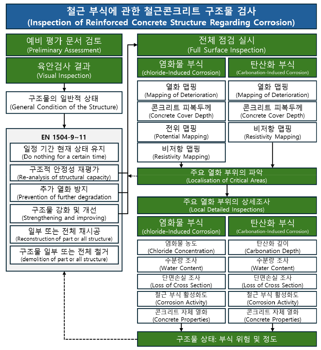 - While the importance of maintenance increases with the aging of concrete structures, premature re-deterioration after repair remains a persistent problem. This is primarily due to incomplete removal of deterioration causes, such as chlorides, during the repair process. This study aims to secure the long-term performance of concrete structures by reviewing international repair guidelines (EN 1504, ACI 546R-14) and recent research trends in deterioration range estimation. International guidelines emphasize accurate estimation of the deterioration range, including potential deterioration areas, through systematic condition assessment, and recommend the use of non-destructive testing (NDT) techniques such as potential mapping. Furthermore, this study analyzes rational repair range setting methods and optimal repair strategies through empirical field studies and probabilistic prediction model research. The results confirm that complete removal of deteriorated areas and thorough surface preparation are key factors for successful repair, and suggest that preventive repair strategies can be economical and effective from a long-term perspective. This study is expected to serve as fundamental data for improving the quality and securing the long-term performance of concrete repair works in Korea.