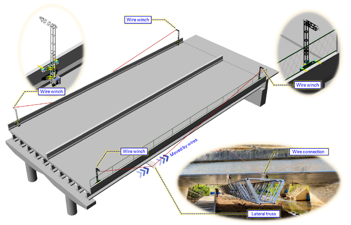 - The wire-based under-bridge inspection technique is a method that utilizes multiple wires to bring a lateral truss close to the bridge underside, move it in the longitudinal direction of the bridge, and automatically collect images of the bridge underside using a Robo-cam installed on the upper part of the lateral truss. In this study, for the integration and functional improvement of the wire-based robot position control system, we proposed improvements to existing components and new sub-components with added functionalities, fabricated these components, and applied the overall system to an actual bridge to evaluate its field applicability. The results of the field application confirmed that the lateral truss, positioned on the bridge’s underside, could be operated with a high control precision of up to approximately 6 mm using the wire winches installed on the bridge deck. However, for this system to be deployed for actual bridge inspection, the development of components for winch installation and integrated testing with the Robo-cam system are necessary.