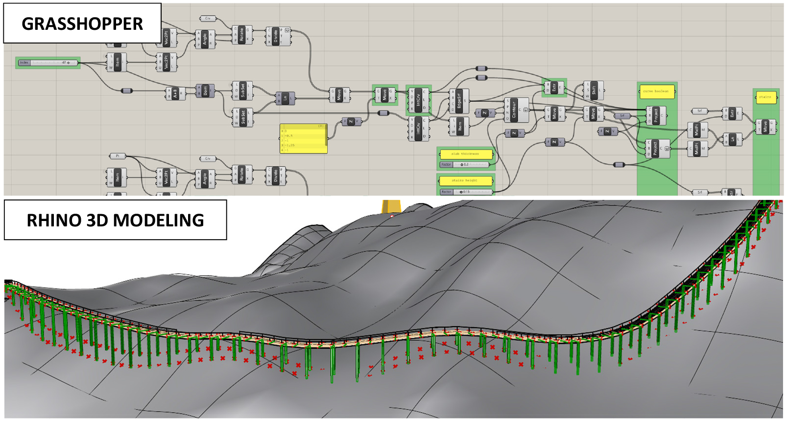 - This paper proposes a conceptual design for a circular elevated walkway in Ngong Ping Village, emphasizing harmony between the mountainous landscape and the site’s Buddhist symbolism. The walkway adopts a circular geometry to represent the Buddhist cycle of life and to provide a continuous spatial journey. A spreadsheet-based process was used to optimize the walkway slope for pedestrian comfort, while Grasshopper enabled a parametric 3D modelling system for rapid and flexible design updates. In addition, the curved bridge segment of the walkway, supported by a spatial arch, was structurally analyzed using MIDAS Civil to verify feasibility.