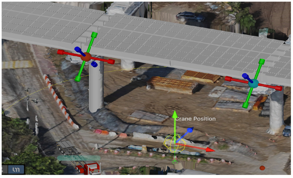 - This study presents the development of a Construction Digital Twin (CDT) system designed to optimize crane operations during the installation of prefabricated bridge decks. Building upon the previous CDT framework, the proposed system introduces a relative coordinate system and an automatic search algorithm to overcome the complexity and surveying dependency inherent in conventional absolute coordinate-based methods. The relative coordinate system defines spatial relationships directly with reference to on-site structures, enabling intuitive and efficient setup of construction environments. Implemented using the Unity engine, the CDT system integrates a grid-based optimization module that automatically identifies the optimal crane positions and simulates lifting operations in real time to verify work feasibility and safety. Field applications confirmed that the system significantly reduces crane repositioning frequency and overall operation time, demonstrating its effectiveness in enhancing construction efficiency. The research contributes a practical and scalable digital twin solution that supports data-driven decision-making and can be readily deployed in actual construction sites without additional surveying processes.